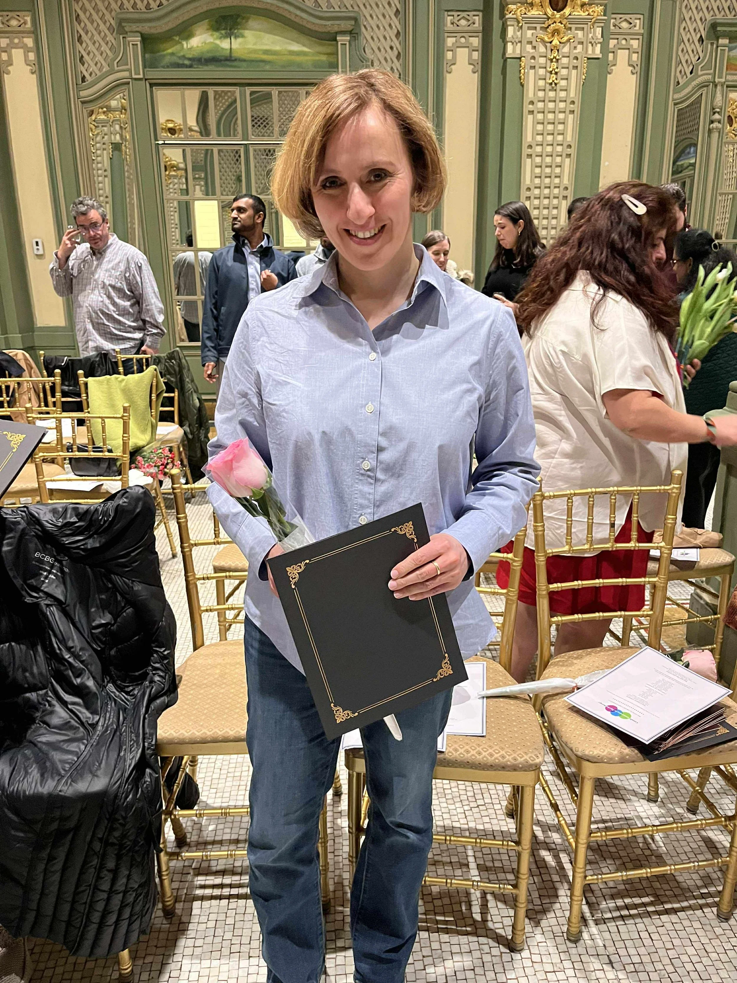 A proud moment — holding my certificate and rose at the graduation ceremony for the Gestalt Associates for Psychotherapy 4-year clinical fellowship. Grateful for the journey, the growth, and the community!
